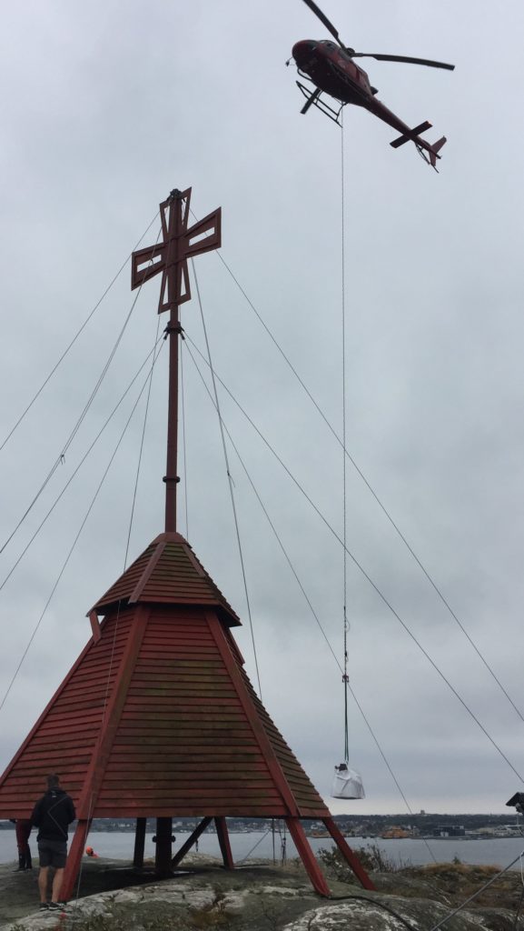 Valens stålkonstruktion har setts över och skrapats ren från rost och nu pågår målning med allt i allt fem tunna strykningar med linoljebaserad långsamtorkande färg.
